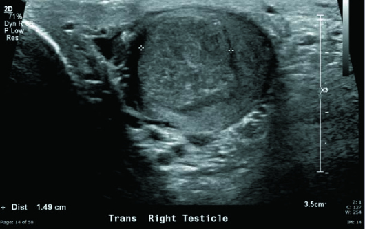 A 35-year-old man presented to urology to plan his scheduled vasectomy. He and his partner welcomed a pair of twin girls seven months prior. During his appointment, he reported a right testicular mass which he noticed approximately two weeks prior. He had been accidently kicked in the groin by his 4-year-old nephew, and the subsequent soreness brought his attention to the area. He had no voiding symptoms. He was referred for a scrotal ultrasound (US).