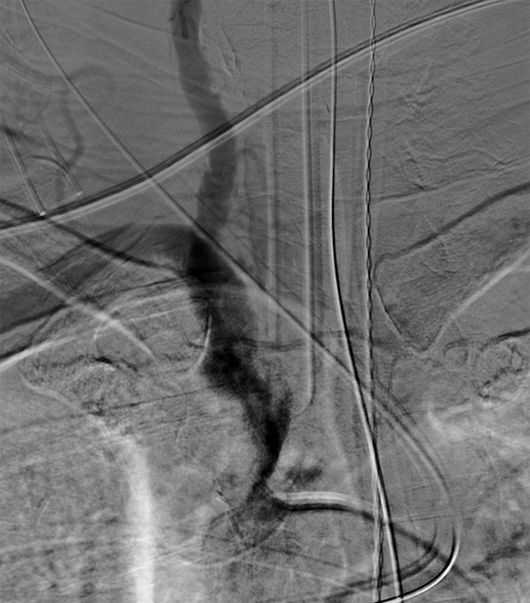 Cross-sectional CT imaging revealed severe atherosclerotic changes along the right innominate artery (Figures 1 and 2). A conventional diagnostic angiogram was then performed for further characterization of the stenosis and possible treatment. The left vertebral artery was the first vessel to be catheterized (Figure 3), and cervical angiography was performed. Retrograde contrast opacification of the contralateral right vertebral artery (Figure 4) and eventual contrast opacification of the right subclavian artery and the internal mammary artery was observed (Figures 5 and 6) suggesting right subclavian steal syndrome (SSS). Diagnostic angiograph evaluation of the remainder of the vessels was carried out and, eventually, a severe right innominate artery stenosis was detected. This was subsequently treated with placement of a stent. A thoracic arch aortogram depicts the postinterventional changes after successful stent placement in the right innominate artery with normal antegrade flow through the right vertebral artery (Figure 7).