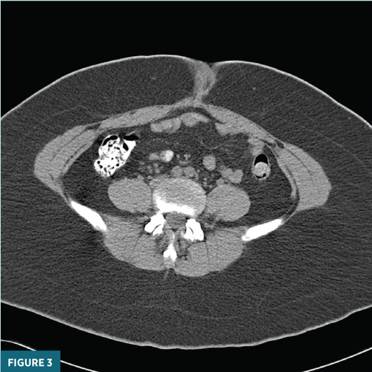 An unenhanced axial CT image at the superior aspect of the umbilicus (Figure 4) revealed a mixed soft tissue and blood attenuation.