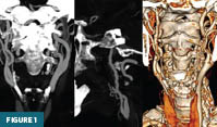 Coronal (Figure 1A) and sagittal (Figure 1B) maximum intensity projection images from CTA of the neck demonstrate a characteristic “string-of-beads” appearance of the right cervical internal carotid artery (ICA), consisting of alternating areas of stenosis and mild aneurysmal dilation with small outpouchings. Coronal 3D volume-rendered reconstructions (Figure 1C) further delineate the irregular vessel contour of the right ICA in contrast to the smooth appearance of the contralateral left ICA.