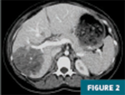 Further evaluation with MRI of the abdomen, with and without IV contrast, demonstrated a persistent large geographic area of nonenhancing hepatic parenchyma in the right hepatic lobe, with MRI morphology most consistent with an infarct (Figures 4-8). The hepatic veins and portal veins were noted to be patent on MRI. Scattered areas of T2 hyperintensity were compatible with edema within the area of presumed infarct. Reactive gallbladder wall thickening was noted without significant distension or gallstones.