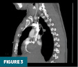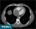 CT pulmonary angiography demonstrated a heterogeneous, lobulated softtissue mass centered within the right atrium, measuring approximately 6.0 × 7.3 × 5.2 cm. The mass caused inferior displacement of the tricuspid valve and leftward deviation of the interatrial septum. A small pericardial effusion was also present (Figures 2 and 3).