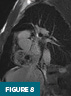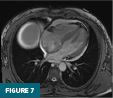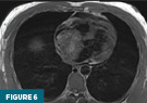 Cardiac MRI performed with and without intravenous contrast showed a heterogeneous right atrial mass nearly filling the atrial cavity. The lesion had a broad-based attachment to the interatrial septum. Punctate foci of intrinsic T1 hyperintensity suggested internal hemorrhage or necrosis. Perfusion and delayed-enhancement sequences demonstrated mild heterogeneous enhancement (Figures 6–9).