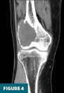 CT of the right knee without IV contrast showed a heterogenous mass within the lateral aspect of the distal femur centered in the metaphysis and extending into the epiphysis. This mass measured 7.1 cm x 6.7 cm x 6.1 cm. There was associated cortical thinning, heterogenous cortical disruption (most prominent along the supralateral aspect), and endosteal scalloping along the margins (Figures 3–5).