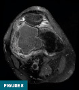 On MRI without and with IV contrast, the lesion was inhomogeneously T2 hyperintense with internal septations (Figure 6) and T1 hypointense (Figure 7). Heterogenous diffuse enhancement of the wall was noted (Figure 8). Additionally, there was moderate reactive bone marrow edema surrounding the lesion (Figure 6).