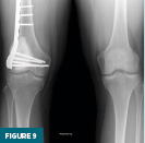 A postoperative radiograph obtained at nearly three months demonstrated the cemented defect in the distal femur with prophylactic plate and screws in appropriate alignment (Figure 9). Continued surveillance with periodic radiographs was recommended for a minimum of two years.